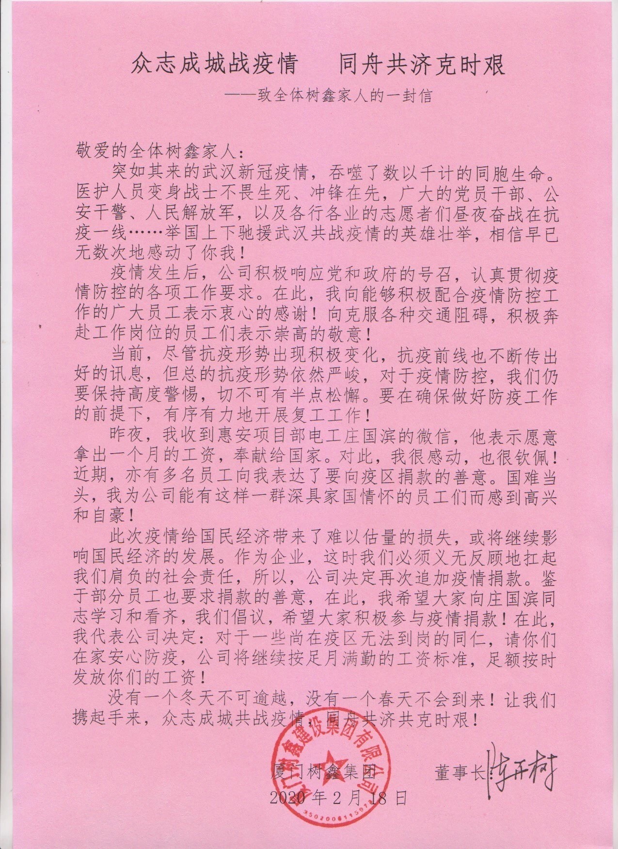 為了支持抗擊疫情,廈門樹鑫集團董事長陳開樹先生表示,守望相助,患難與共是中華民族的精神內(nèi)核,共同抗擊疫情是集團義不容辭的責(zé)任和義務(wù)。陳董在第一時間簽發(fā)了《致全體樹鑫家人的一封信》,倡議全體員工、各合作單位等積極參與疫情捐款。