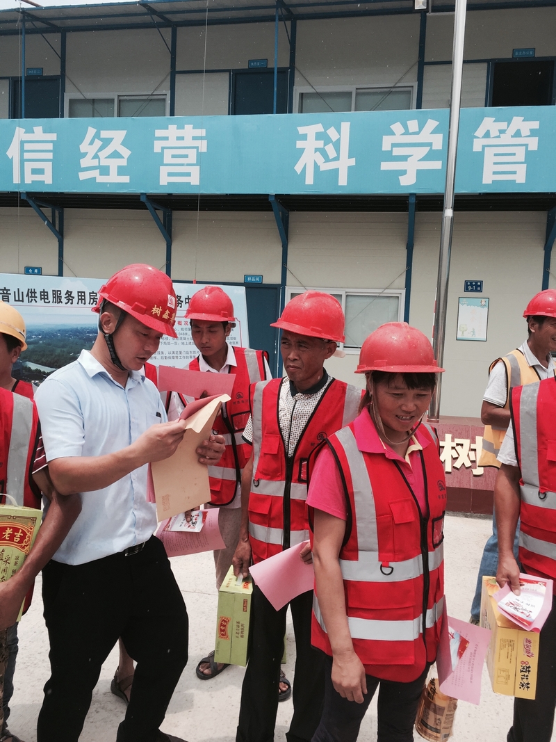 項目部管理人員向一線員工分發、宣傳安全施工資料。